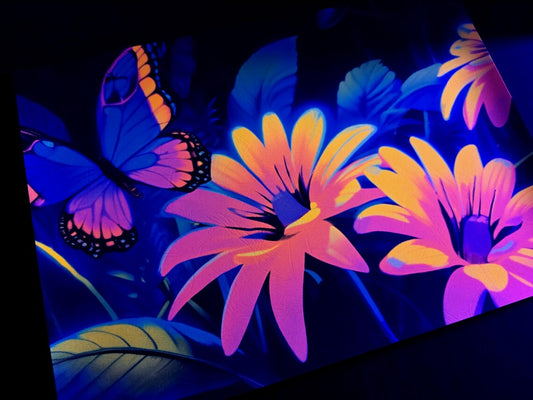 Uv Fantasy Floral Butterfly print, A4, A3,wall art, poster, neon art, flower, glow in the dark