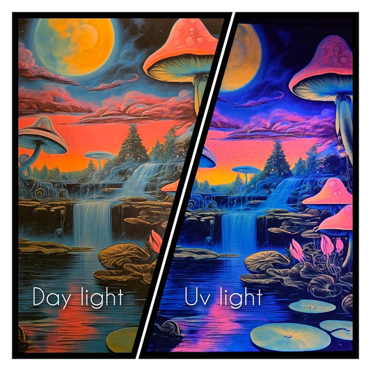 Uv Reactive Fantasy forest waterfall print, A4, A3, wall art, poster