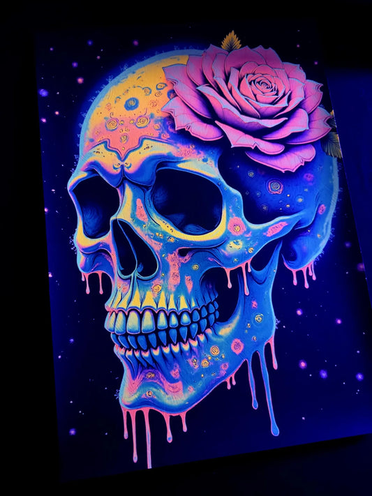 Uv Reactive Calavera dripping Skull & Flowers print, A4, A3,wall art, poster.