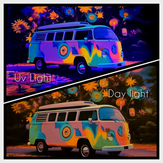 Uv Camper print A4, A3,wall art, poster, neon art, van life, glow in the dark, Blacklight wall decor