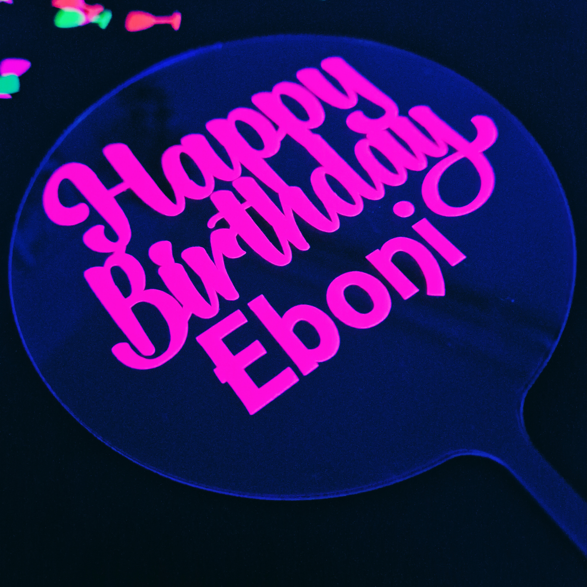 Throwing a uv party? let us help you personalise the birthday cake with this magnificent uv reactive glowing acrylic Happy birthday cake topper, personalised with the birthday girl or boys name watch it glow crazy under uv lighting really making your cake that extra bit special!