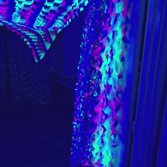 Turn any space into a neon-drenched wonderland with our UV Rainbow Blacklight Reactive Stretch Camo Netting — the ultimate stretch UV event decor for high-impact installations.
