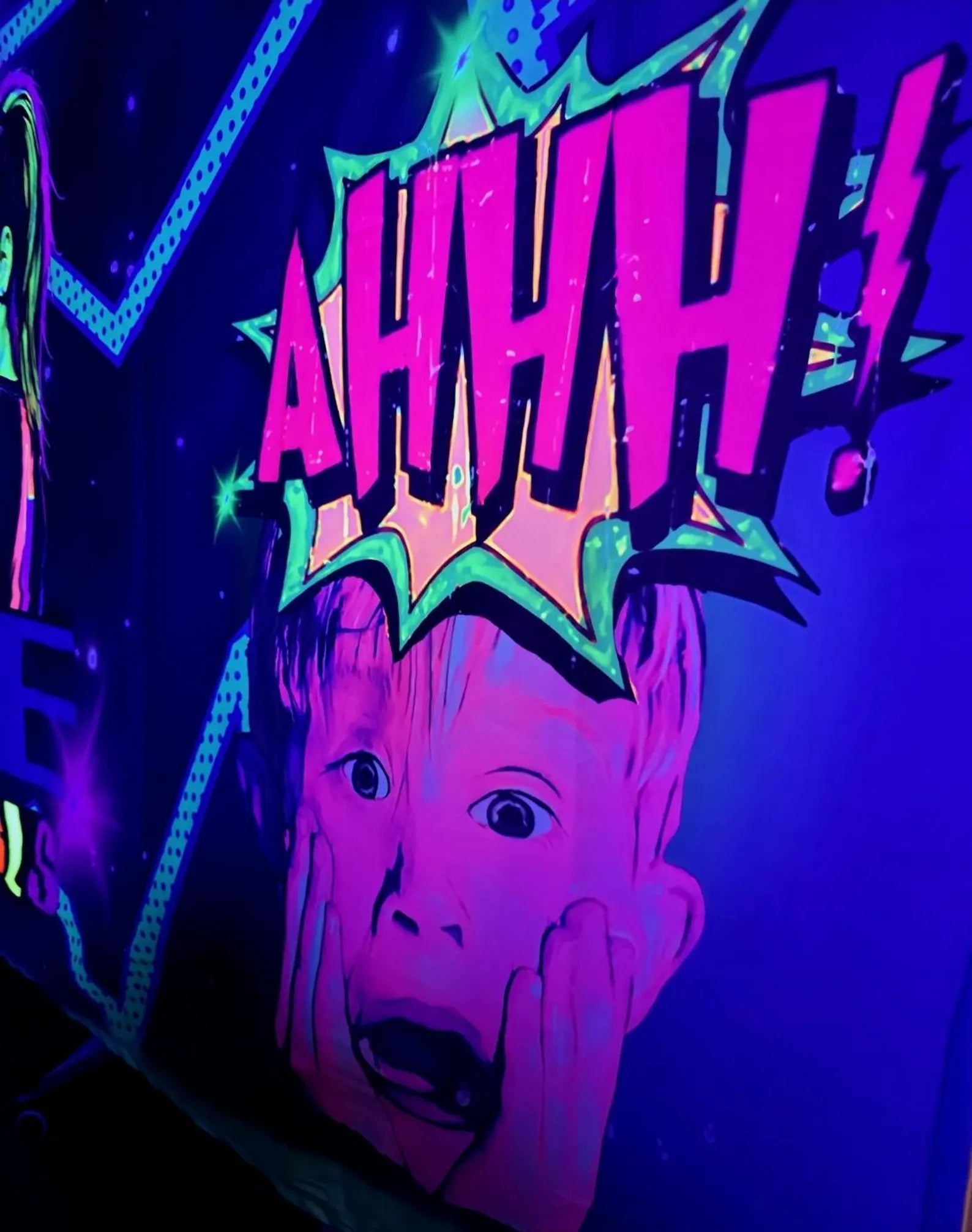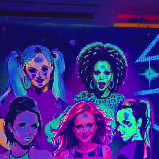 Transform your space in 90s theme with this giant UV reactive back to the 90s Tapestry, designed to captivate and energize any room or event. Perfect for DJ booths, festival, themed party this vibrant, neon tapestry comes alive under UV light, creating an immersive experience.