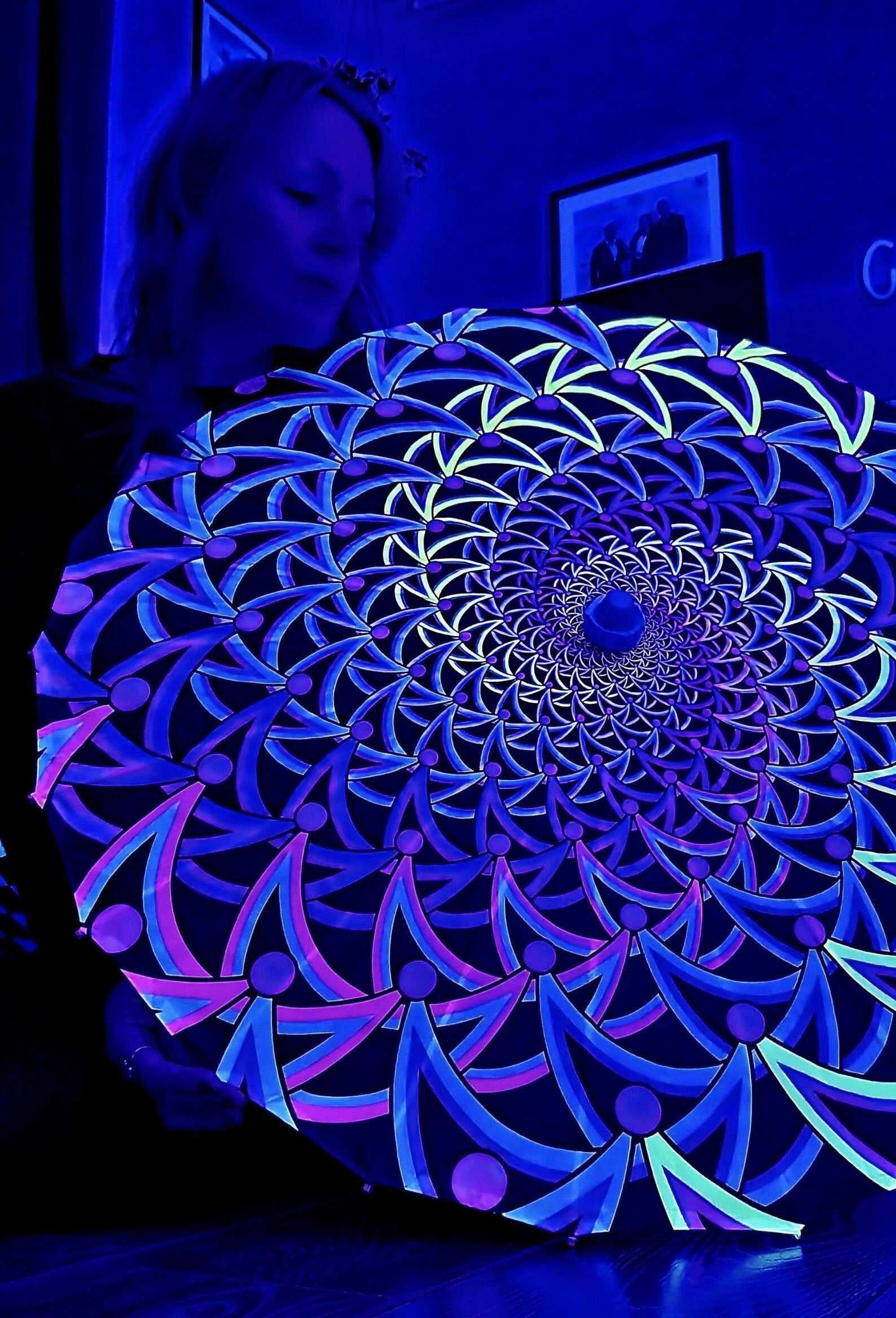 Uv Reactive Bamboo parasol sun shade, Blacklight umbrella, Festivals, photos shoots, ceiling uv decor, Performers or dancers accessories