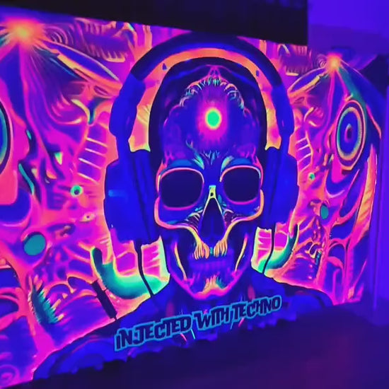 Transform your space with this stunning UV-reactive techno skull tapestry!