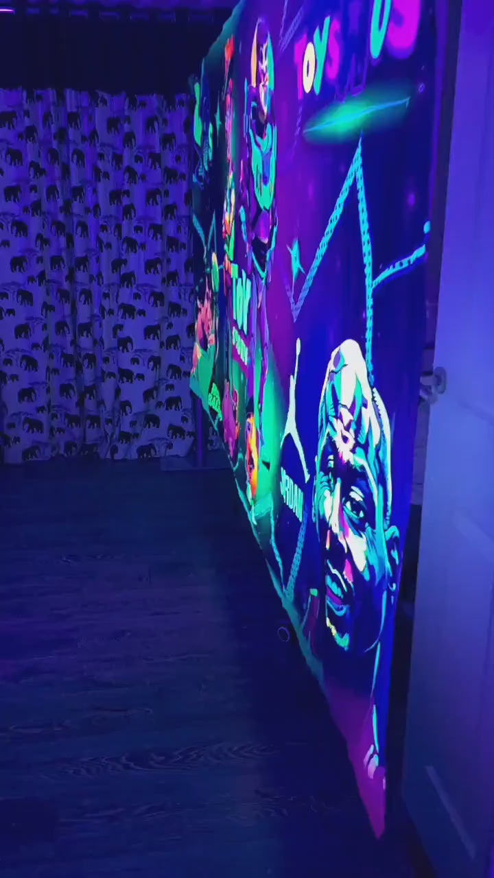 Transform your space in 90s theme with this giant UV reactive back to the 90s Tapestry, designed to captivate and energize any room or event. Perfect for DJ booths, festival, themed party this vibrant, neon tapestry comes alive under UV light, creating an immersive experience.
