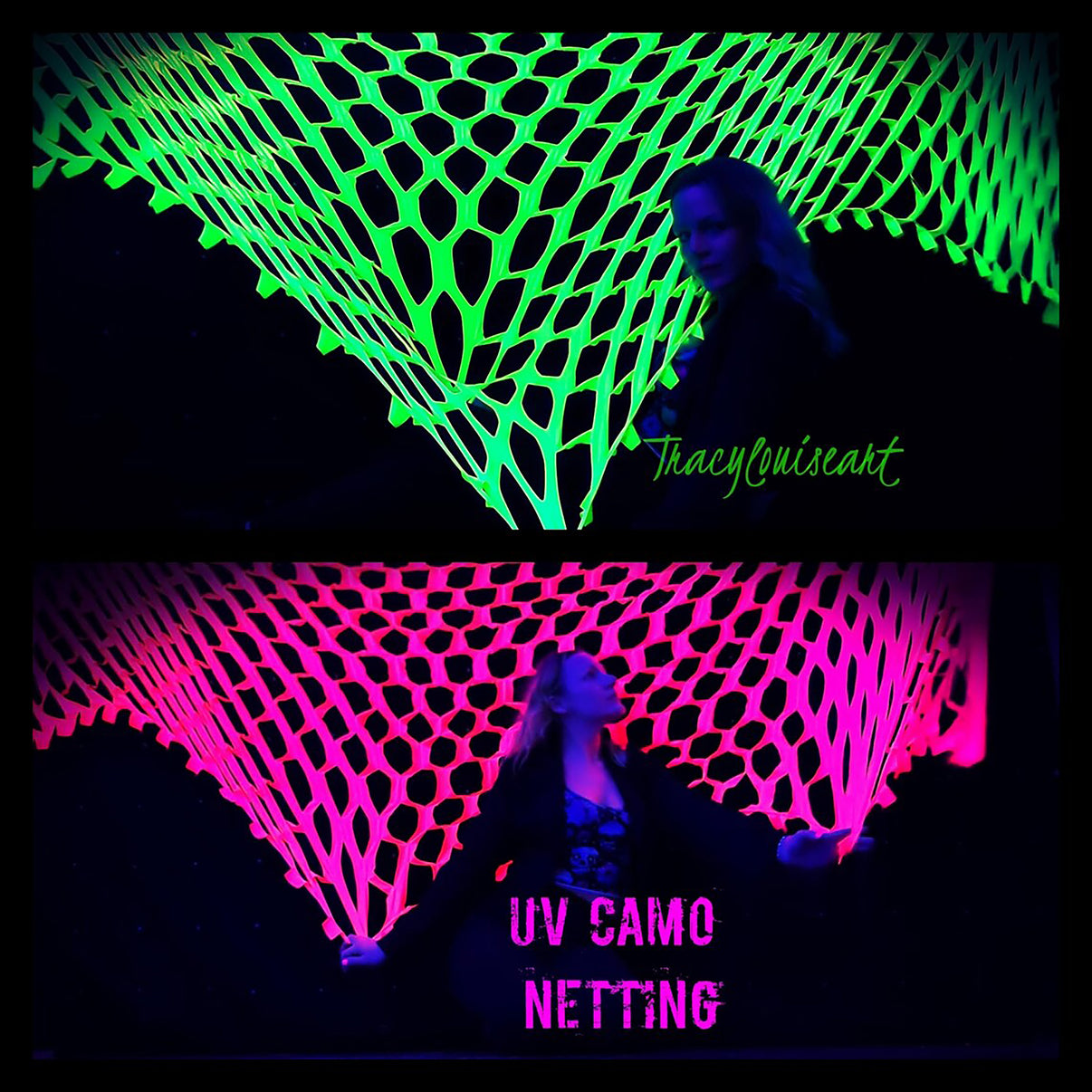 Light up your empty space in minutes these glow stretchy camo nets glow so Bright under uv lighting.