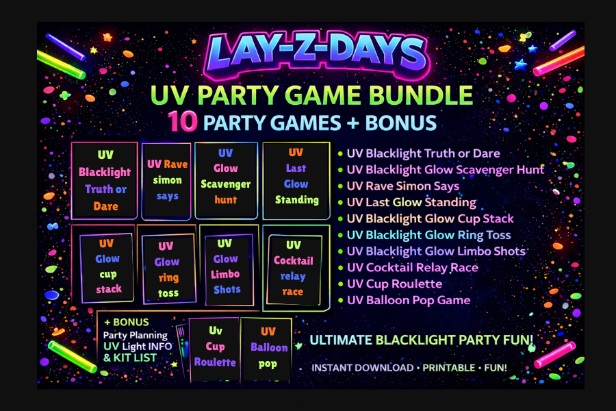 Click Download, and your files will be saved to your device. You can then print them, share them, or use them right away for your UV party, neon wall art, or games.
